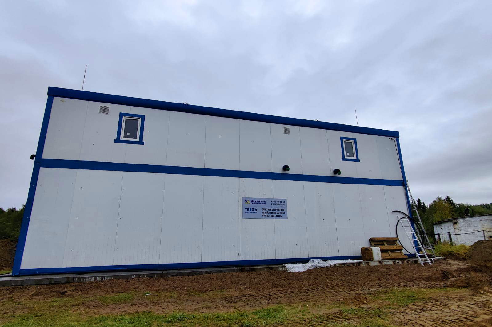 Станция очистки бытовых сточных вод "ТВЕРЬ-12С" представляет из себя утепленное здание из блок-модулей, установленных на фундаменте, со всем технологическим оборудованием внутри.