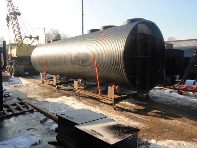 - Корпус изготовлен из низколегированной стали с многослойным антикоррозийным покрытием. Возможно изготовление из спирально-витого ПНД или стеклопластика.